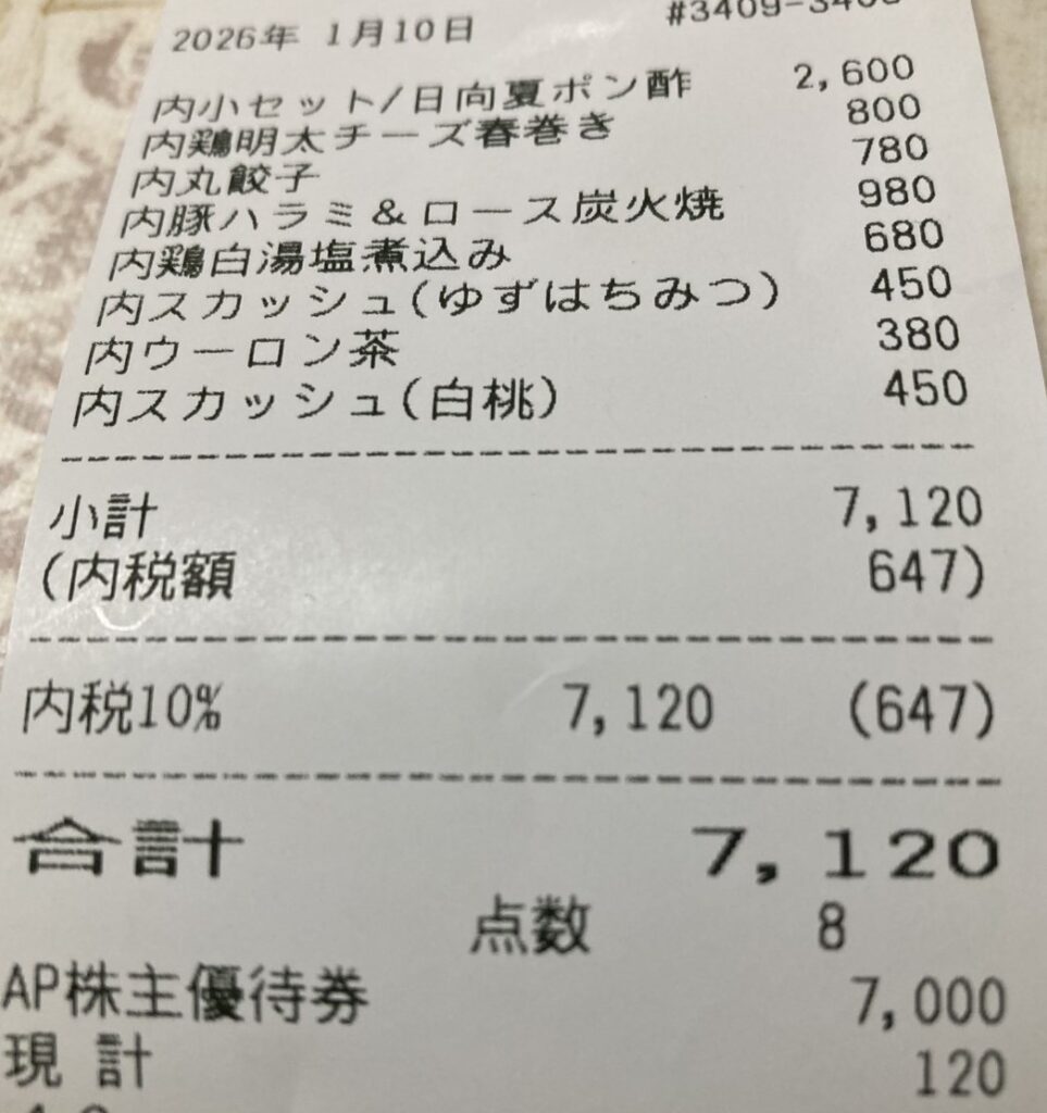 今回は株主優待券を使って、現金支払いはたったの120円! これはお得すぎる〜!