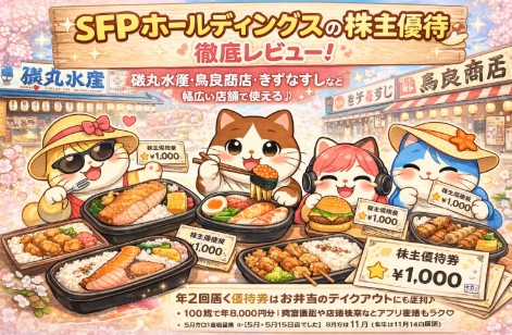 磯丸水産や鳥良商店、きずなすしなど幅広い店舗で使えて、とても便利なSFPホールディングスの株主優待。年2回届く優待券は、お弁当のテイクアウトにも使えるので使い勝手抜群です。我が家では近所に店舗がないため、お出かけついでに利用することが多いのですが、ボリューム満点のお弁当が実質無料になるのはやっぱり嬉しいところ。アプリ管理もできて、残高確認や店舗検索も簡単。今回は実際にテイクアウトで使ってみた感想や、優待内容・権利日・到着時期まで詳しくレビューしていきます。